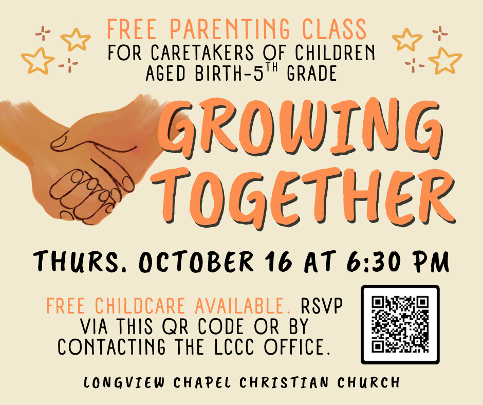 Parenting is a rewarding journey, but it can feel overwhelming at times. Join us for Growing Together, our first Parenting Class of the season, on Thursday, Oct. 16 at 6:30 p.m. This is for parents of kids aged from birth through 5th grade. Registration is required as we will be providing childcare for those who need it.