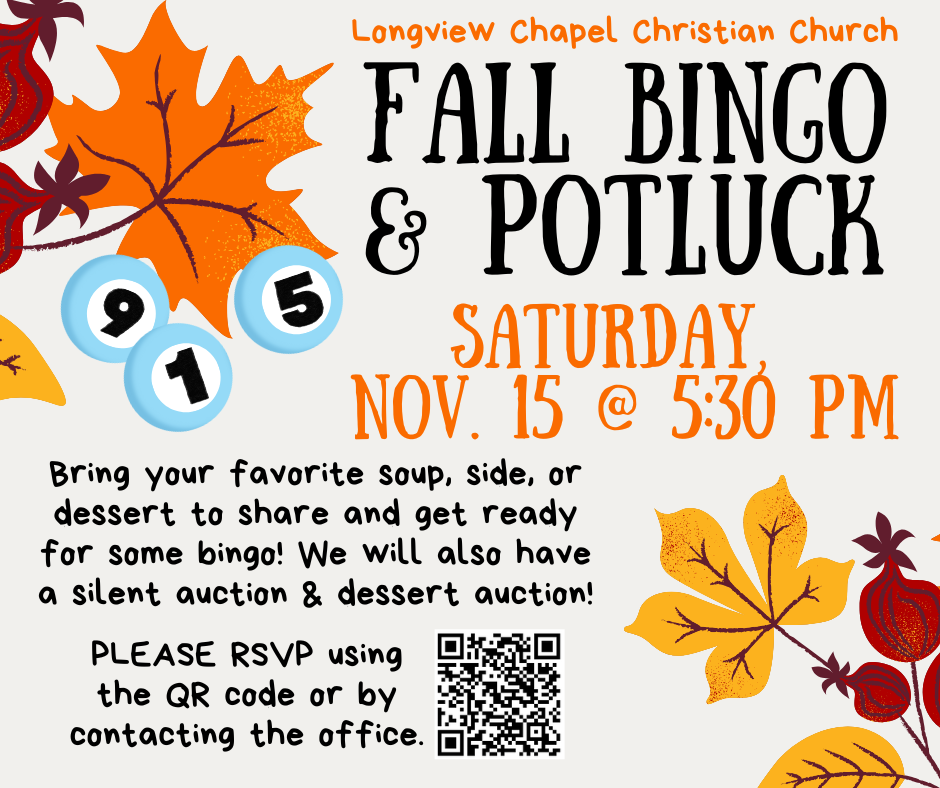Longview Chapel invites you to join us for our Fall Bingo & Potluck on Saturday, November 15, beginning at 5:30 p.m. All ages are welcome to join us. This event is FREE and open to the public! Space is limited, so please register ASAP.